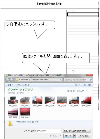 (2) 挿入したシートが前面に表示されます。画面の左端にある「写真領域」を クリックして「画像ファイルを開く」画面を表示します。