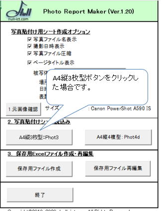 (1) 「A4縦3枚型:Phot3」ボタンをクリックすると「Main Menu」シートの右隣りに下図に示す 写真貼り付け用シートを読み込みます。