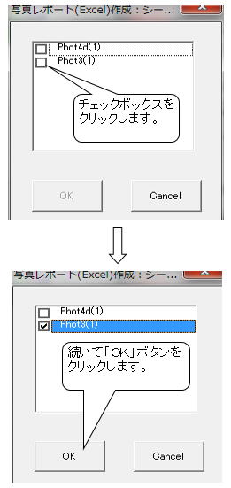 (1)「シート選択」画面が表示されますので、レポートに使用するシート名のチェックボックスをクリックします。