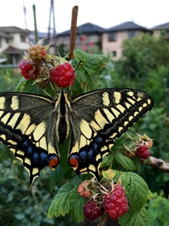 (左)ラズベリーの蜜を吸うキアゲハ