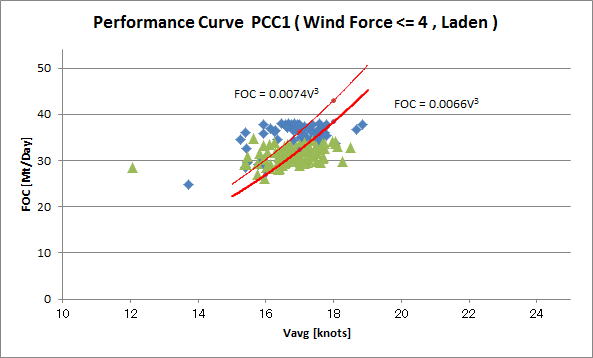 下図は前々回ドック後2年間の毎日のヌーンレポートから抽出したデータ(紺の散布図)とデータの中央値を通る3乗曲線に、前回ドック以降2年間のデータ(黄緑の散布図)を重ね合わせ、上図の場合と同様に3乗曲線を使ってPerformance