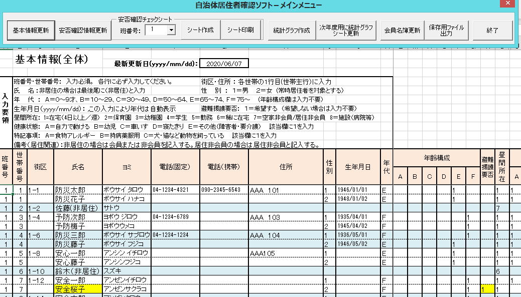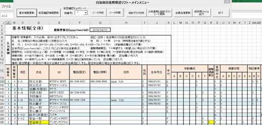 本ソフトの「基本情報」シートに入力することにより、自治会全居住者の現況を一覧表にて確認できるようにしています。