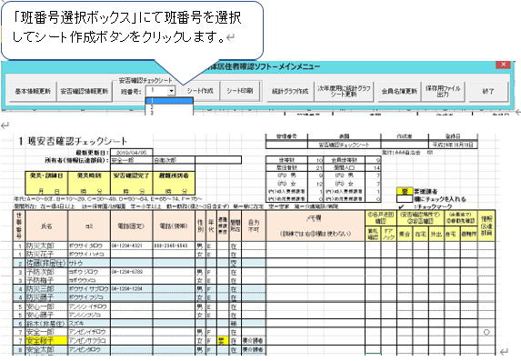 メインメニューの「班番号選択ボックス」にて班番号を選択して「シート作成」ボタンをクリックすると「安否確認CheckSht」シート上に当該班用のチェックシートが自動生成されます。
