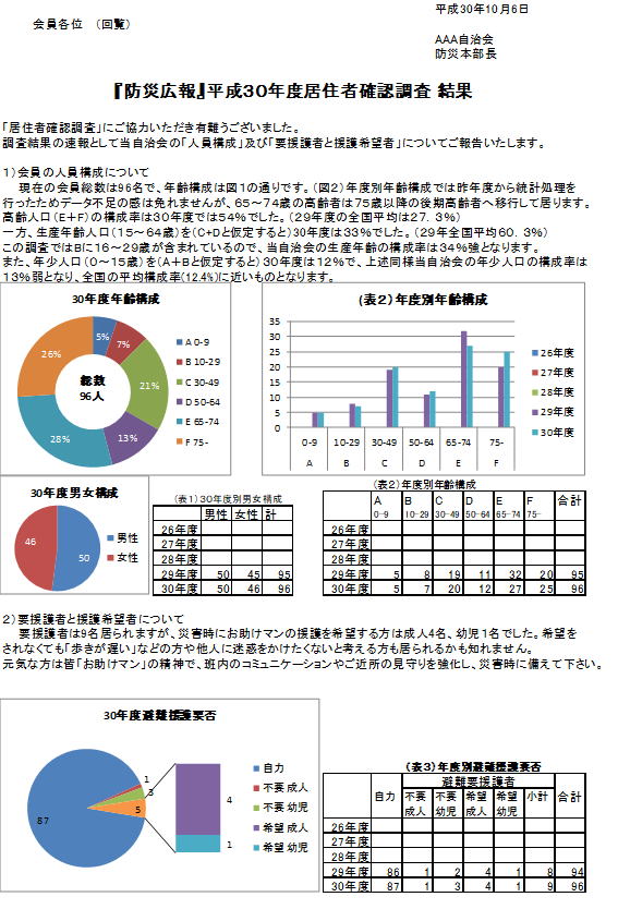 下図はAAA自治会のダミーデータから平成30年度の年齢構成、男女構成、 避難援護要否をグラフ化するとともに