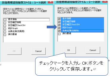 「保存用ファイル出力」ボタンをクリックすると保存するシートの選択画面が表示されます。チェックマークを入力して「OK」ボタンをクリックすることにより