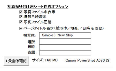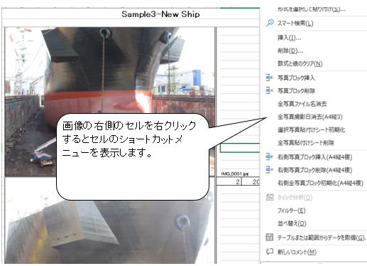 各画像の横に表示されている写真ファイル名と撮影日時は写真貼り付け終了後に セルのショートカットメニュー「全写真ファイル名消去」及び 「全写真撮影日消去」