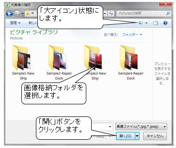 「元画像確認」ボタンをクリックすると下図に示す「元画像の確認」画面が表示されるので画面の右上にあるアイコンを「大アイコン」状態にします。