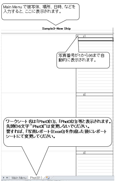 (1) 「A4縦3枚型:Phot3」ボタンをクリックすると「Main Menu」シートの右隣りに下図に示す 写真貼り付け用シートを読み込みます。