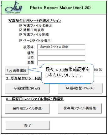 基本的に「Main Menu」 シートのボタン「元画像確認」から「保存用Excelファイル作成」までを順に実行すれば報告用ファイルを作成することができます。