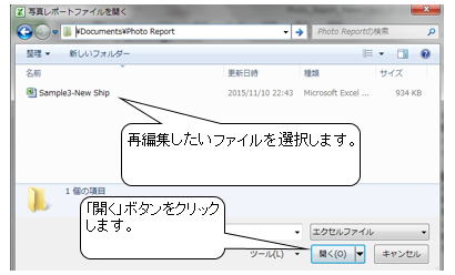「再編集」ボタンをクリックすると、「Photo Report」フォルダに作成済みの写真レポート(Excel) の選択画面が表示されます。