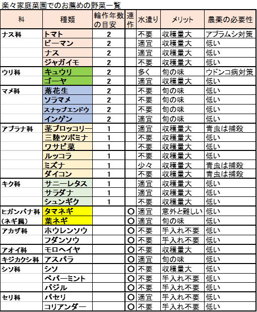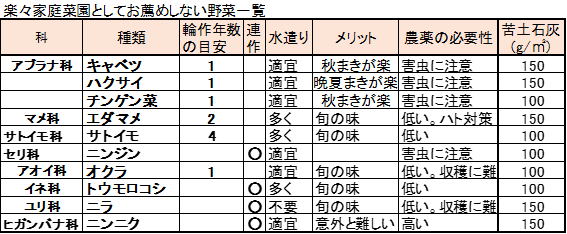 その他、一覧表には載せていないが、スイカ、カボチャ、サツマイモなど場所を取る野菜は狭い菜園ではお薦めできない。