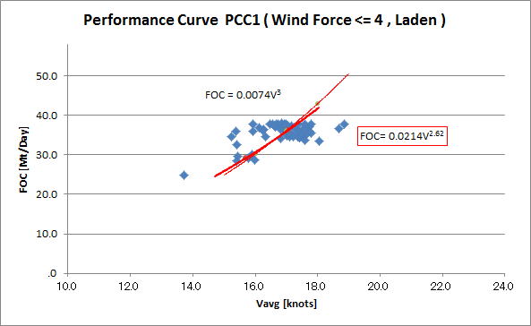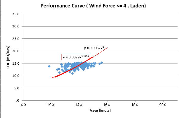 下図は前々回ドック後2年間の毎日のヌーンレポートから抽出したデータを散布図に纏めたものですが、 本船の場合は多少の減速航海データがあることから実海域データを使って回帰曲線を描いてみました。