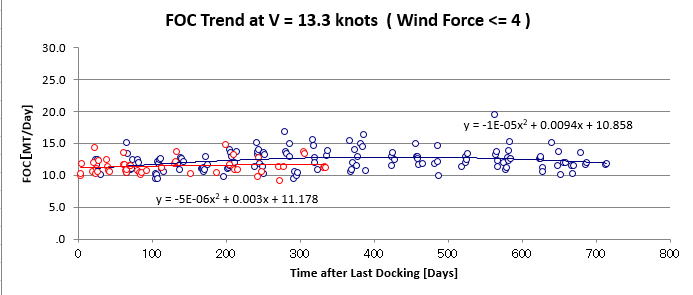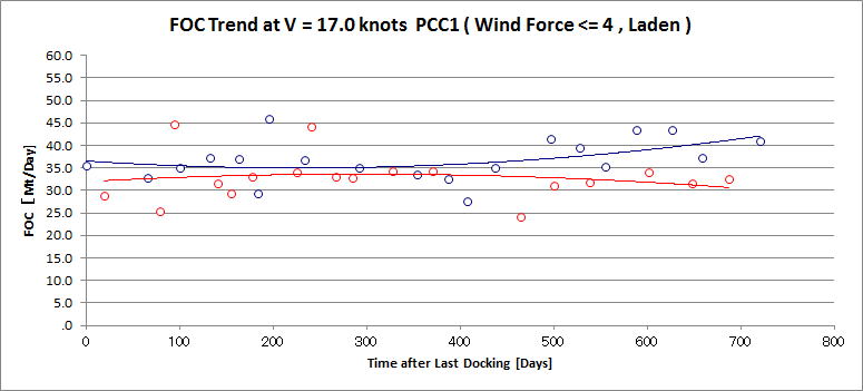 下図は速力と排水量を一定(上の図と同一排水量)にして期間1の日々の燃費推移(紺の曲線)と前回ドック以降の1年間の日々の燃費推移(赤の曲線)を重ね合わせたものです。
