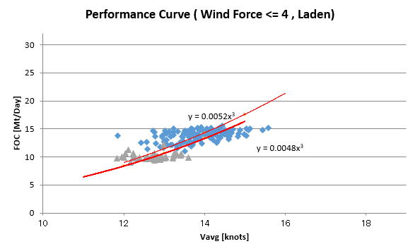 下図は前々回ドック後2年間の毎日のヌーンレポートから抽出したデータ(紺の散布図)とデータの中央値を通る3乗曲線に、前回ドック以降2年間のデータ(黄緑の散布図)を重ね合わせ、上図の場合と同様に3乗曲線を使ってPerformance